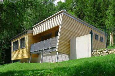 in Mischbauweise als Niedrigenergiehaus errichtet. Die Holzfassade und das Dach bilden in gleicher Konstruktionsart eine durchgängige und homogene Gebäudehülle.