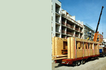 Die gedrehte Tragkonstruktion aus Stahlbeton, als Speichermasse, ermöglicht die Ausführung einer vorgefertigten Gebäudehülle aus Holz ohne Tragfunktion.
