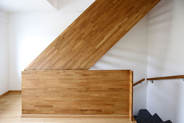 Das Reihenmittelhaus aus den 60er Jahren, in einem einfachen Baustandard errichtet, wurde von Grund auf saniert und räumlich neu aufgeteilt. Im Erdgeschoss befindet sich der Wohn-, Ess- und Kochbereich. Durch das Öffnen der Fassade zum Garten, gelangt Tageslicht bis tief in den Raum. Im Obergeschoss befinden sich zwei Kinderzimmer und das Bad. Die neue Holztreppe verbindet das Obergeschoss mit dem ausgebauten Dachgeschoss, dem elterlichen Schlafzimmer.